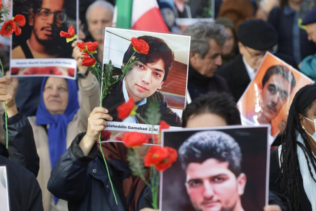 « Nous, participants à la série de manifestations mondiales organisées à l’occasion de l’anniversaire du soulèvement de 2022, rendons hommage aux 120 000 martyrs de la nouvelle révolution du peuple iranien et renouvelons notre engagement envers les 750 fiers martyrs de ce glorieux soulèvement pour le renversement de ce régime criminel, et soulignons ce qui suit :