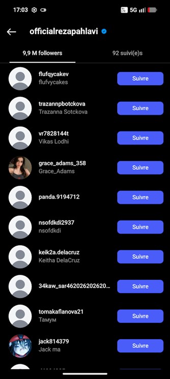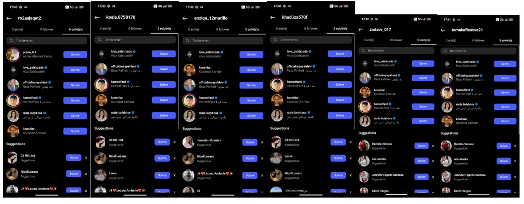 En analysant plus en détail ces profils, nous avons pu voir un pattern qui se dégageait. Tous ces profils ont des pseudonymes alternant séparateur (. – _) et des chiffres aléatoires. Un pattern se dégage dans le suivi de certains profils. Ces profils suivent uniquement Reza pahlavi et ses soutiens (influenceurs et personnalités politiques).