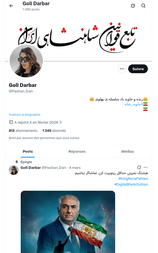 Voici le type de publication que ce profil relaye : que des publications à la gloire du fils du shah et contre leurs opposants. Une grande partie de ces publications sont générées via l’IA